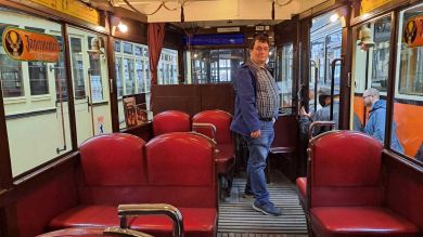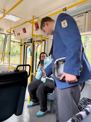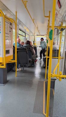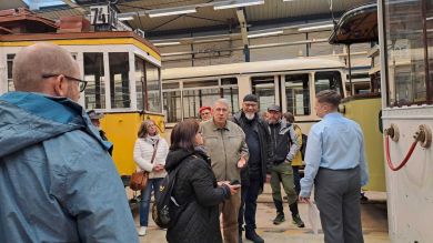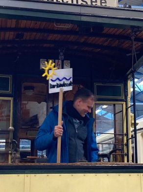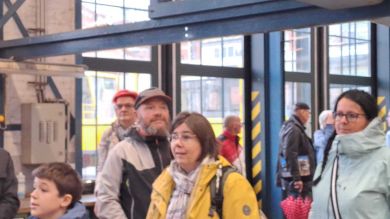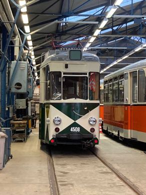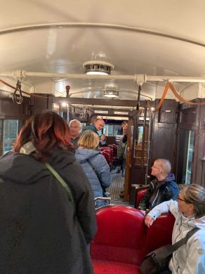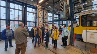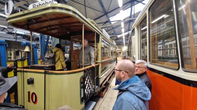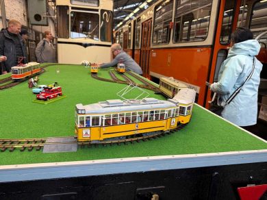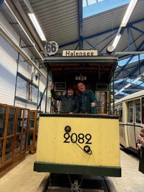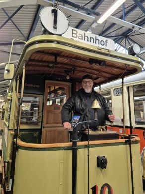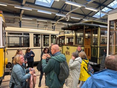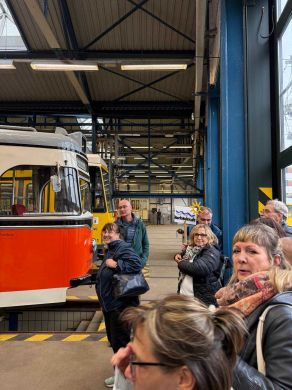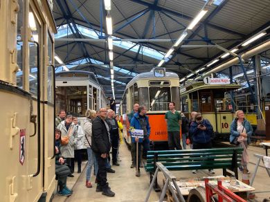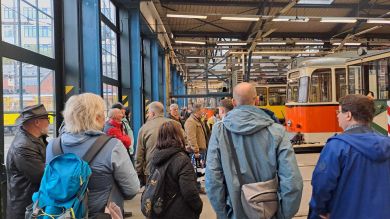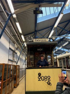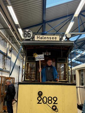 Am nächsten Vormittag (Samstag, 04.10.2025) trafen sich 35 Kurkinder und Begleitungen (davon ein neues Kurkind) vor dem HW-Hotel in Berlin-Kaulsdorf an einem Reisebus, der uns zum Straßenbahnbetriebshof Köpenick brachte. Auf dem Betriebshof Köpenick werden die historischen Straßenbahnen der Berliner Verkehrsbetriebe von ehrenamtlichen Mitarbeitern des Denkmalpflegevereins Nahverkehr gepflegt und gewartet. Dort angekommen, wurden wir von Herrn Hartmut Gröschke, ein Kollege von Kurkind Stefan Peter-Roloff und Mitglied des Vorstandes des DVN empfangen. Das große Glück war uns hold, dass wir zunächst mit der jüngsten historischen Straßenbahn, ein Tatra T6A2mod mit Beiwagen B6A2mod aus Tschechien, Baujahr 1988, Umbau in den 1990er Jahren, vom Betriebshof Köpenick nach Wendenschloß und wieder zurückfahren konnten. Im Anschluss haben wir einen tollen Einblick in mehr als 160 Jahre Straßenbahngeschichte Berlins erhalten. Unter fachkundiger Führung durch das Team der Mitarbeitenden beim DVN dürften wir bis ins Detail den Fahrzeugpark bis hin zu den neuesten Fahrzeugen besichtigen. Es war ein MockUp-Model der neuesten Berliner Straßenbahn zu sehen, der Urbanliner (kurz UBL), von denen bisher 4 Fahrzeuge geliefert worden sind, derzeit getestet werden und etwa zum Jahresende 2025 in den Linienbetrieb überführt werden sollen.