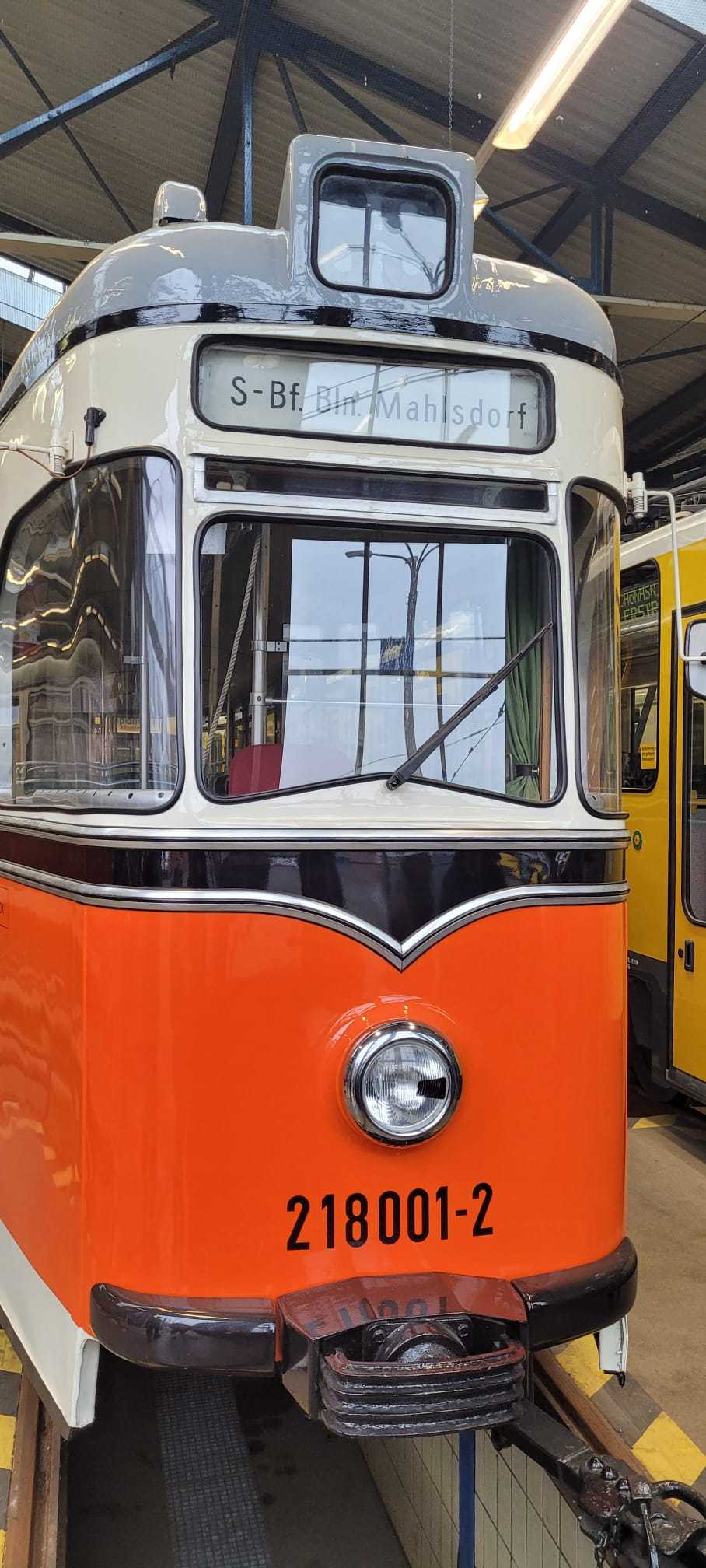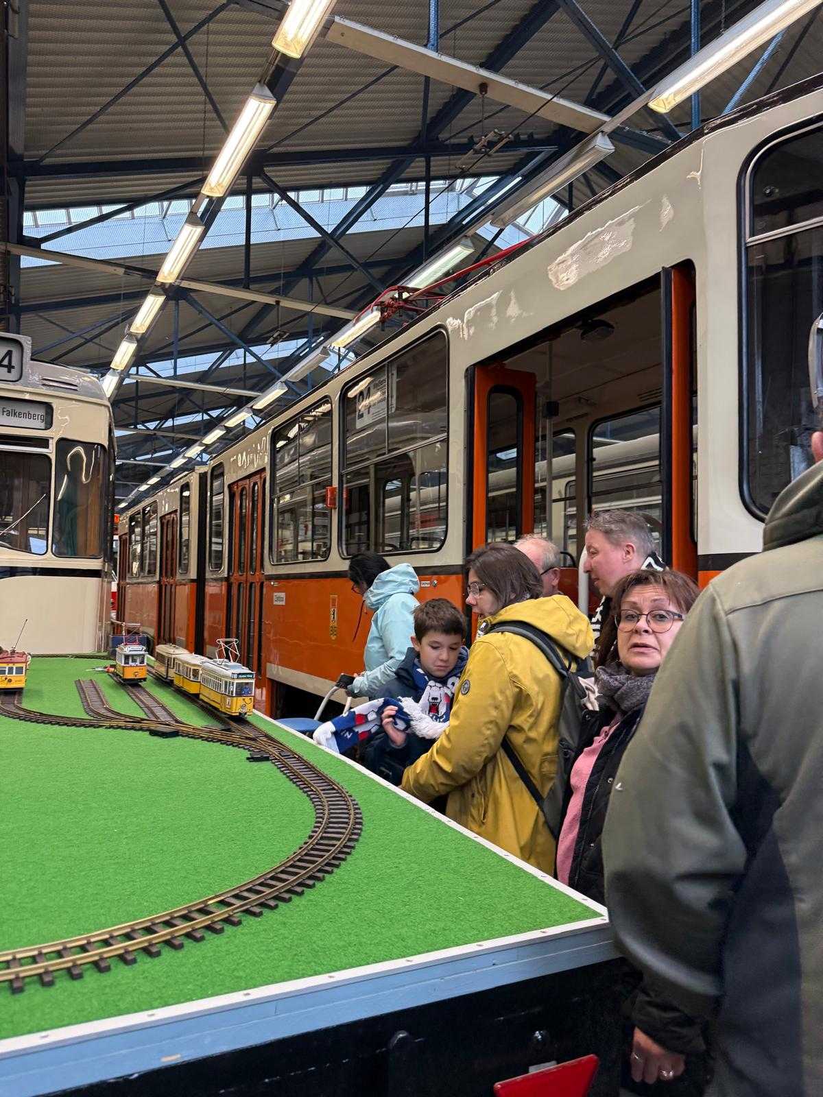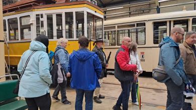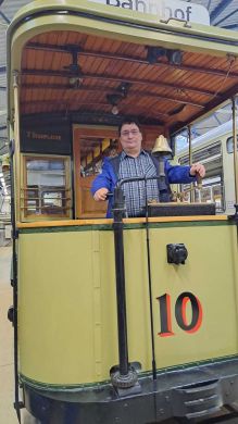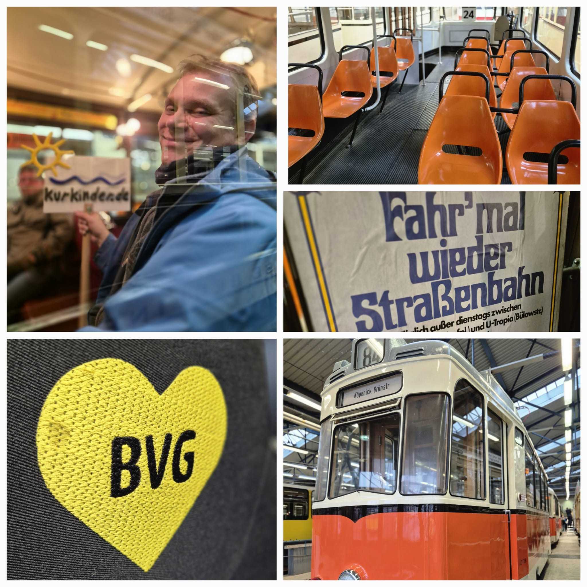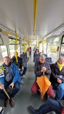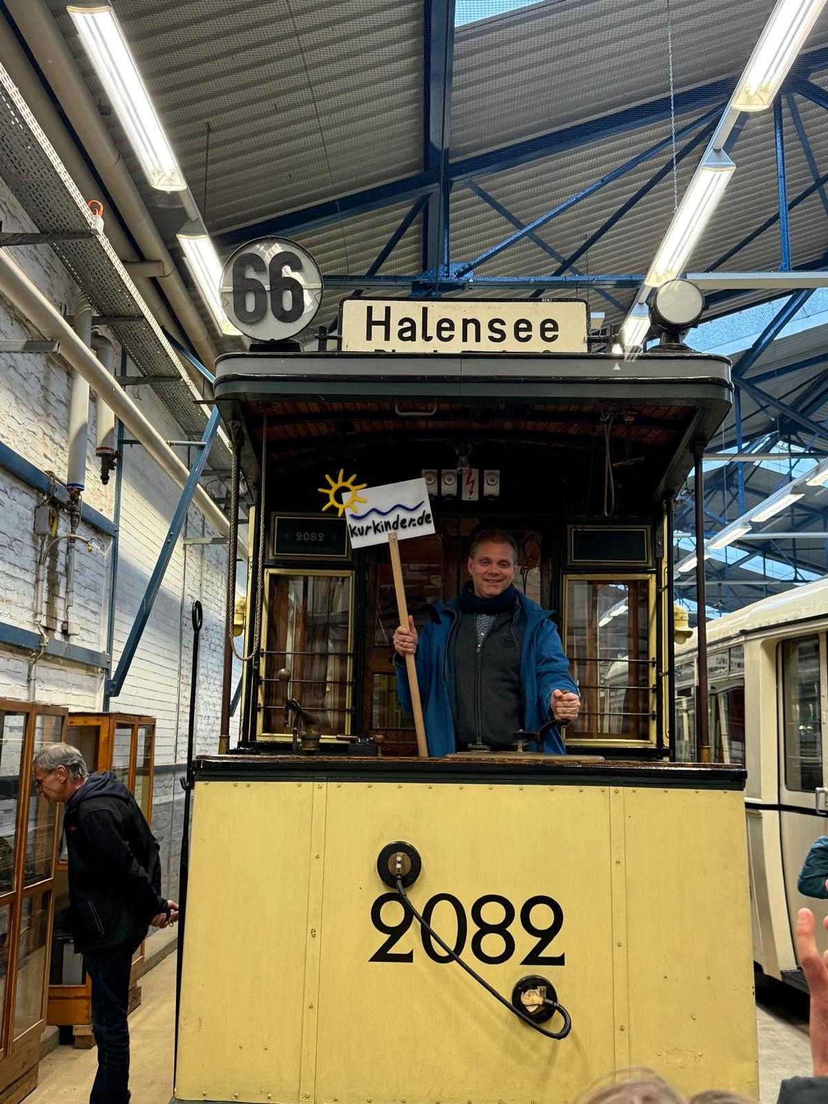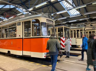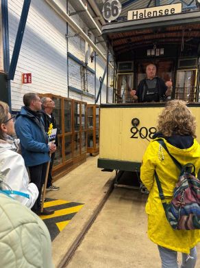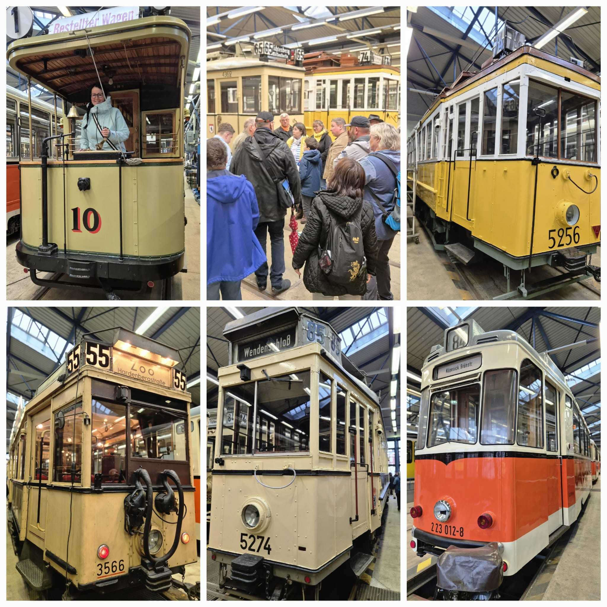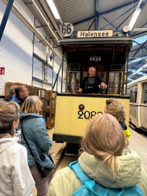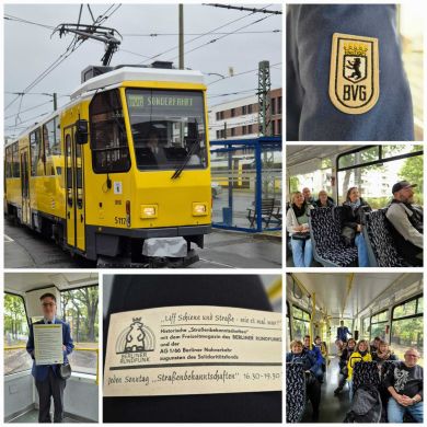 Am nächsten Vormittag (Samstag, 04.10.2025) trafen sich 35 Kurkinder und Begleitungen (davon ein neues Kurkind) vor dem HW-Hotel in Berlin-Kaulsdorf an einem Reisebus, der uns zum Straßenbahnbetriebshof Köpenick brachte. Auf dem Betriebshof Köpenick werden die historischen Straßenbahnen der Berliner Verkehrsbetriebe von ehrenamtlichen Mitarbeitern des Denkmalpflegevereins Nahverkehr gepflegt und gewartet. Dort angekommen, wurden wir von Herrn Hartmut Gröschke, ein Kollege von Kurkind Stefan Peter-Roloff und Mitglied des Vorstandes des DVN empfangen. Das große Glück war uns hold, dass wir zunächst mit der jüngsten historischen Straßenbahn, ein Tatra T6A2mod mit Beiwagen B6A2mod aus Tschechien, Baujahr 1988, Umbau in den 1990er Jahren, vom Betriebshof Köpenick nach Wendenschloß und wieder zurückfahren konnten. Im Anschluss haben wir einen tollen Einblick in mehr als 160 Jahre Straßenbahngeschichte Berlins erhalten. Unter fachkundiger Führung durch das Team der Mitarbeitenden beim DVN dürften wir bis ins Detail den Fahrzeugpark bis hin zu den neuesten Fahrzeugen besichtigen. Es war ein MockUp-Model der neuesten Berliner Straßenbahn zu sehen, der Urbanliner (kurz UBL), von denen bisher 4 Fahrzeuge geliefert worden sind, derzeit getestet werden und etwa zum Jahresende 2025 in den Linienbetrieb überführt werden sollen.