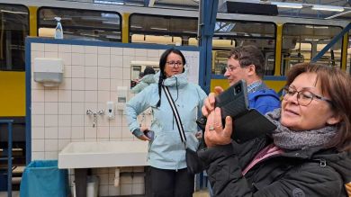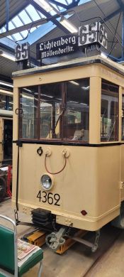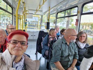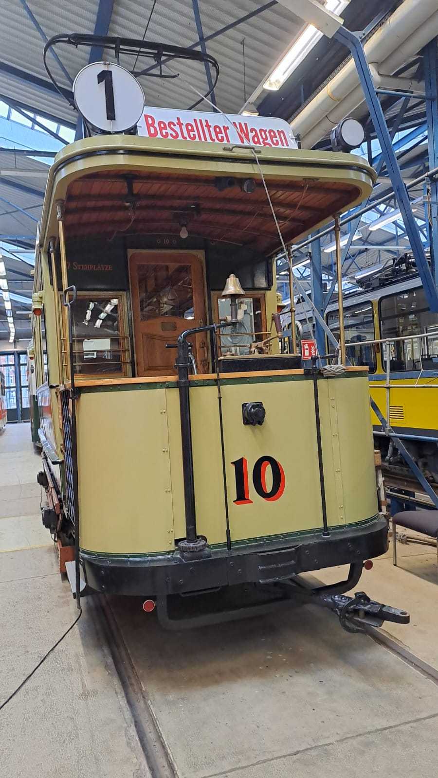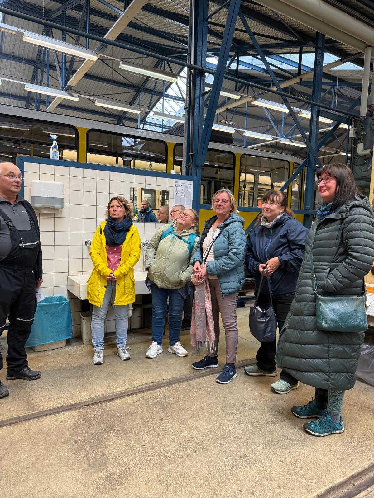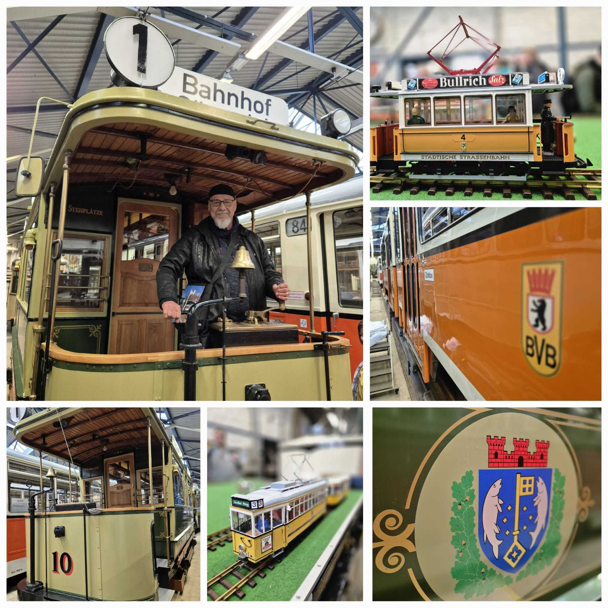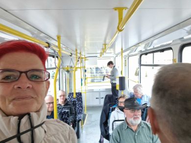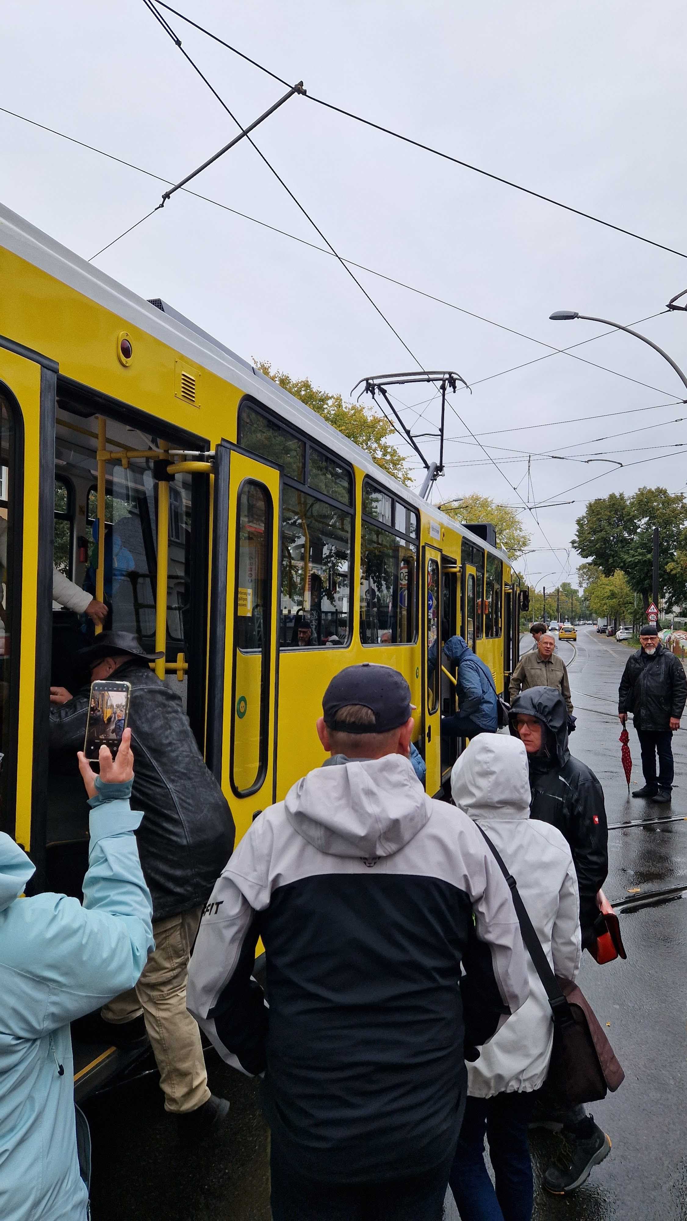 Am nächsten Vormittag (Samstag, 04.10.2025) trafen sich 35 Kurkinder und Begleitungen (davon ein neues Kurkind) vor dem HW-Hotel in Berlin-Kaulsdorf an einem Reisebus, der uns zum Straßenbahnbetriebshof Köpenick brachte. Auf dem Betriebshof Köpenick werden die historischen Straßenbahnen der Berliner Verkehrsbetriebe von ehrenamtlichen Mitarbeitern des Denkmalpflegevereins Nahverkehr gepflegt und gewartet. Dort angekommen, wurden wir von Herrn Hartmut Gröschke, ein Kollege von Kurkind Stefan Peter-Roloff und Mitglied des Vorstandes des DVN empfangen. Das große Glück war uns hold, dass wir zunächst mit der jüngsten historischen Straßenbahn, ein Tatra T6A2mod mit Beiwagen B6A2mod aus Tschechien, Baujahr 1988, Umbau in den 1990er Jahren, vom Betriebshof Köpenick nach Wendenschloß und wieder zurückfahren konnten. Im Anschluss haben wir einen tollen Einblick in mehr als 160 Jahre Straßenbahngeschichte Berlins erhalten. Unter fachkundiger Führung durch das Team der Mitarbeitenden beim DVN dürften wir bis ins Detail den Fahrzeugpark bis hin zu den neuesten Fahrzeugen besichtigen. Es war ein MockUp-Model der neuesten Berliner Straßenbahn zu sehen, der Urbanliner (kurz UBL), von denen bisher 4 Fahrzeuge geliefert worden sind, derzeit getestet werden und etwa zum Jahresende 2025 in den Linienbetrieb überführt werden sollen.
