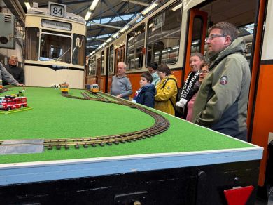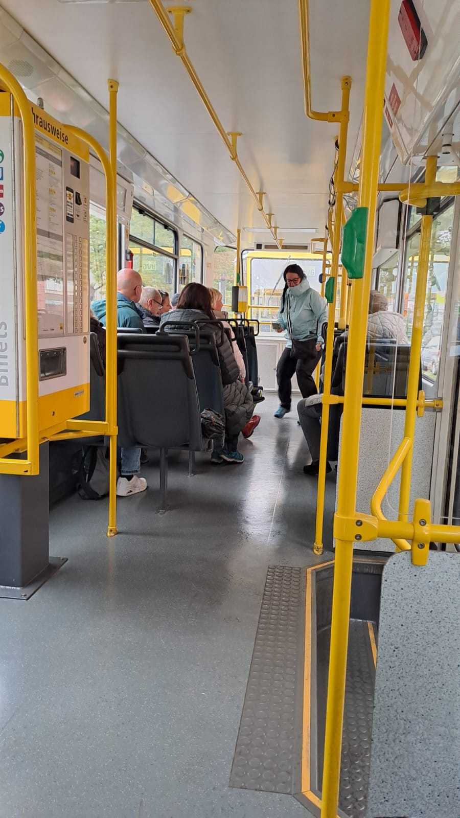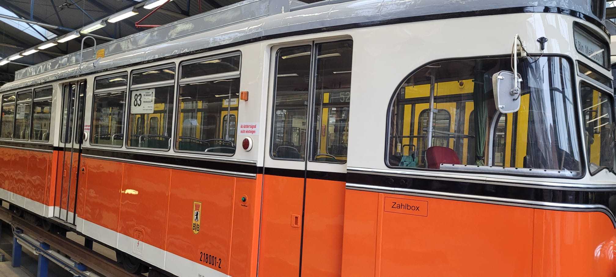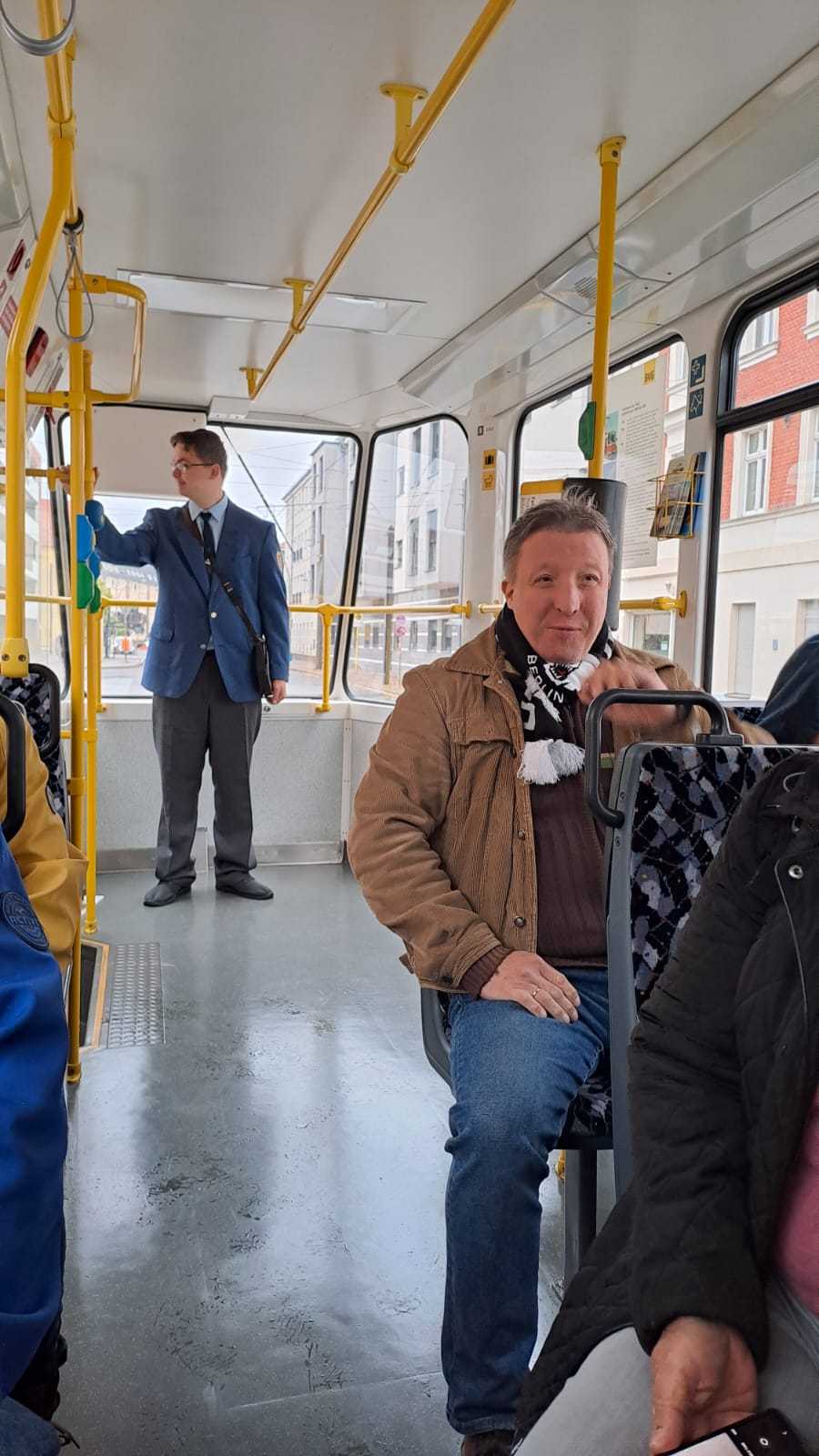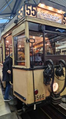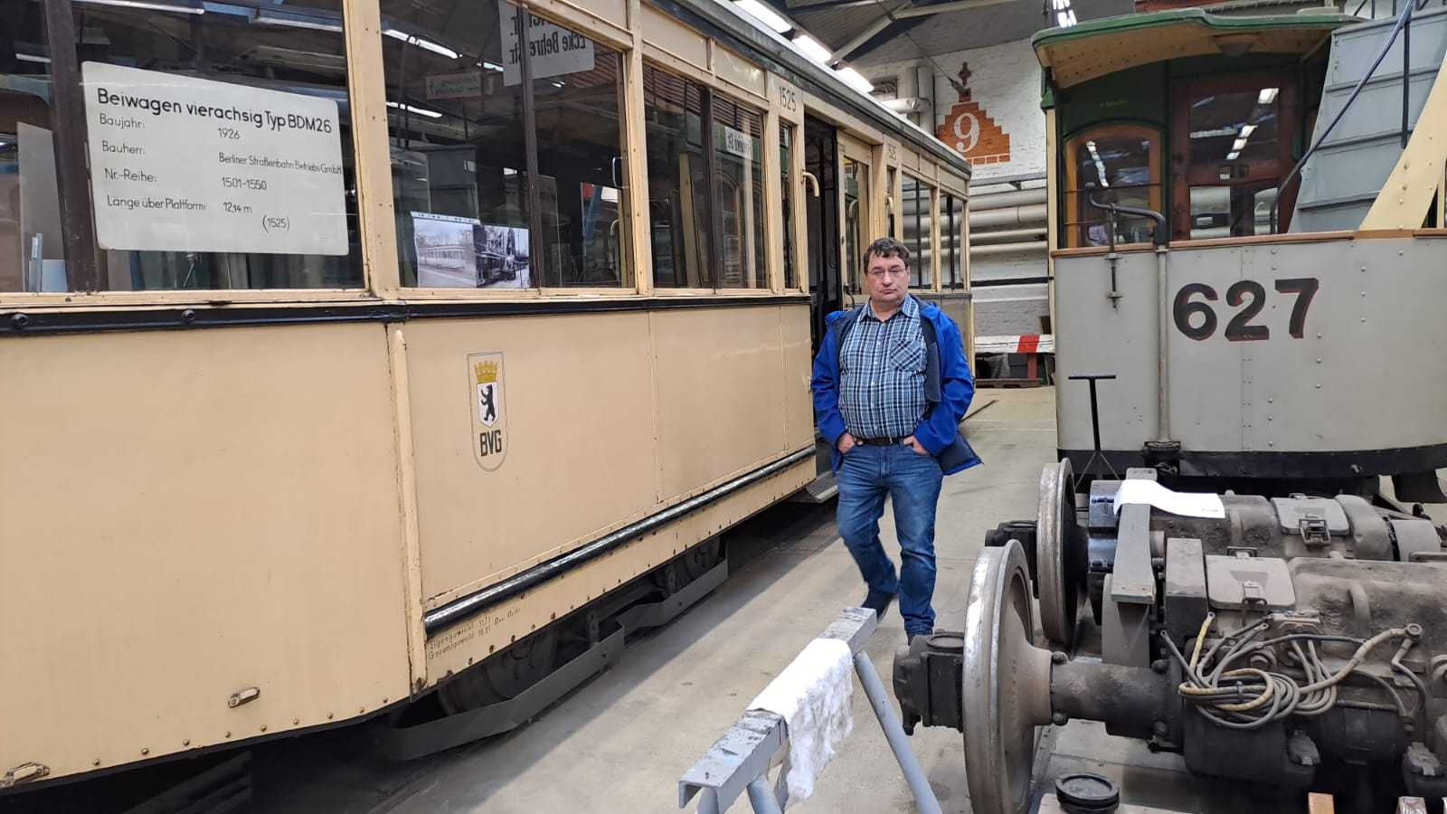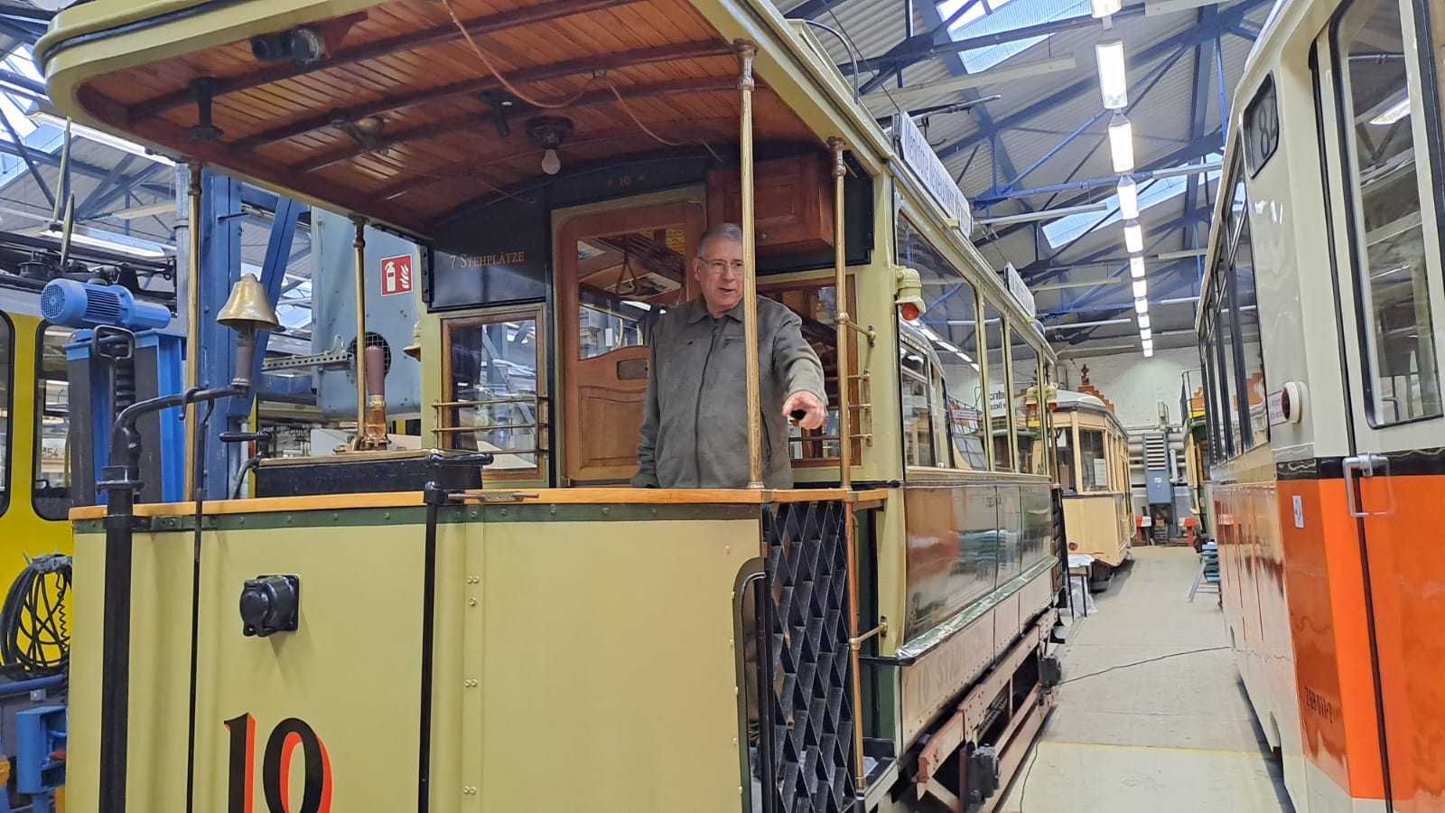 Am nächsten Vormittag (Samstag, 04.10.2025) trafen sich 35 Kurkinder und Begleitungen (davon ein neues Kurkind) vor dem HW-Hotel in Berlin-Kaulsdorf an einem Reisebus, der uns zum Straßenbahnbetriebshof Köpenick brachte. Auf dem Betriebshof Köpenick werden die historischen Straßenbahnen der Berliner Verkehrsbetriebe von ehrenamtlichen Mitarbeitern des Denkmalpflegevereins Nahverkehr gepflegt und gewartet. Dort angekommen, wurden wir von Herrn Hartmut Gröschke, ein Kollege von Kurkind Stefan Peter-Roloff und Mitglied des Vorstandes des DVN empfangen. Das große Glück war uns hold, dass wir zunächst mit der jüngsten historischen Straßenbahn, ein Tatra T6A2mod mit Beiwagen B6A2mod aus Tschechien, Baujahr 1988, Umbau in den 1990er Jahren, vom Betriebshof Köpenick nach Wendenschloß und wieder zurückfahren konnten. Im Anschluss haben wir einen tollen Einblick in mehr als 160 Jahre Straßenbahngeschichte Berlins erhalten. Unter fachkundiger Führung durch das Team der Mitarbeitenden beim DVN dürften wir bis ins Detail den Fahrzeugpark bis hin zu den neuesten Fahrzeugen besichtigen. Es war ein MockUp-Model der neuesten Berliner Straßenbahn zu sehen, der Urbanliner (kurz UBL), von denen bisher 4 Fahrzeuge geliefert worden sind, derzeit getestet werden und etwa zum Jahresende 2025 in den Linienbetrieb überführt werden sollen.