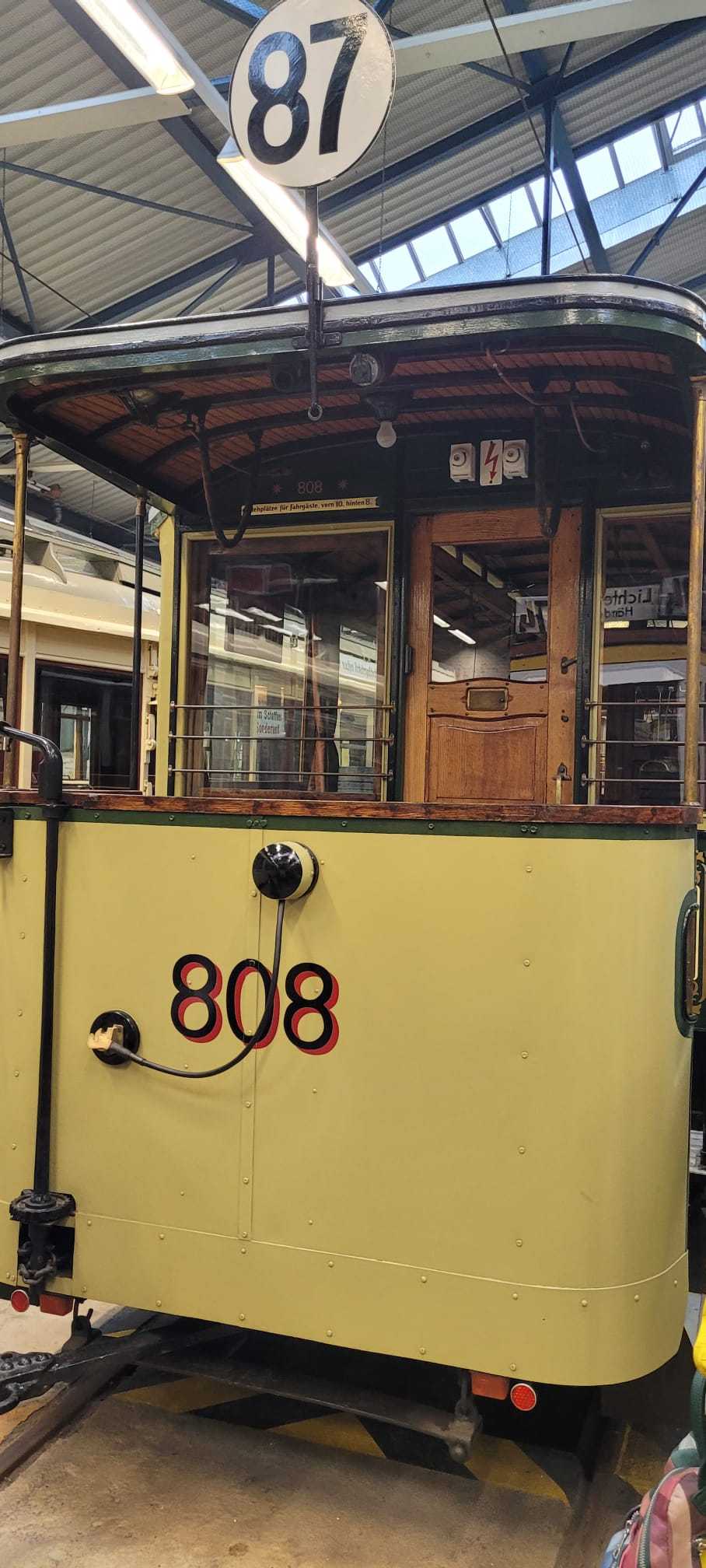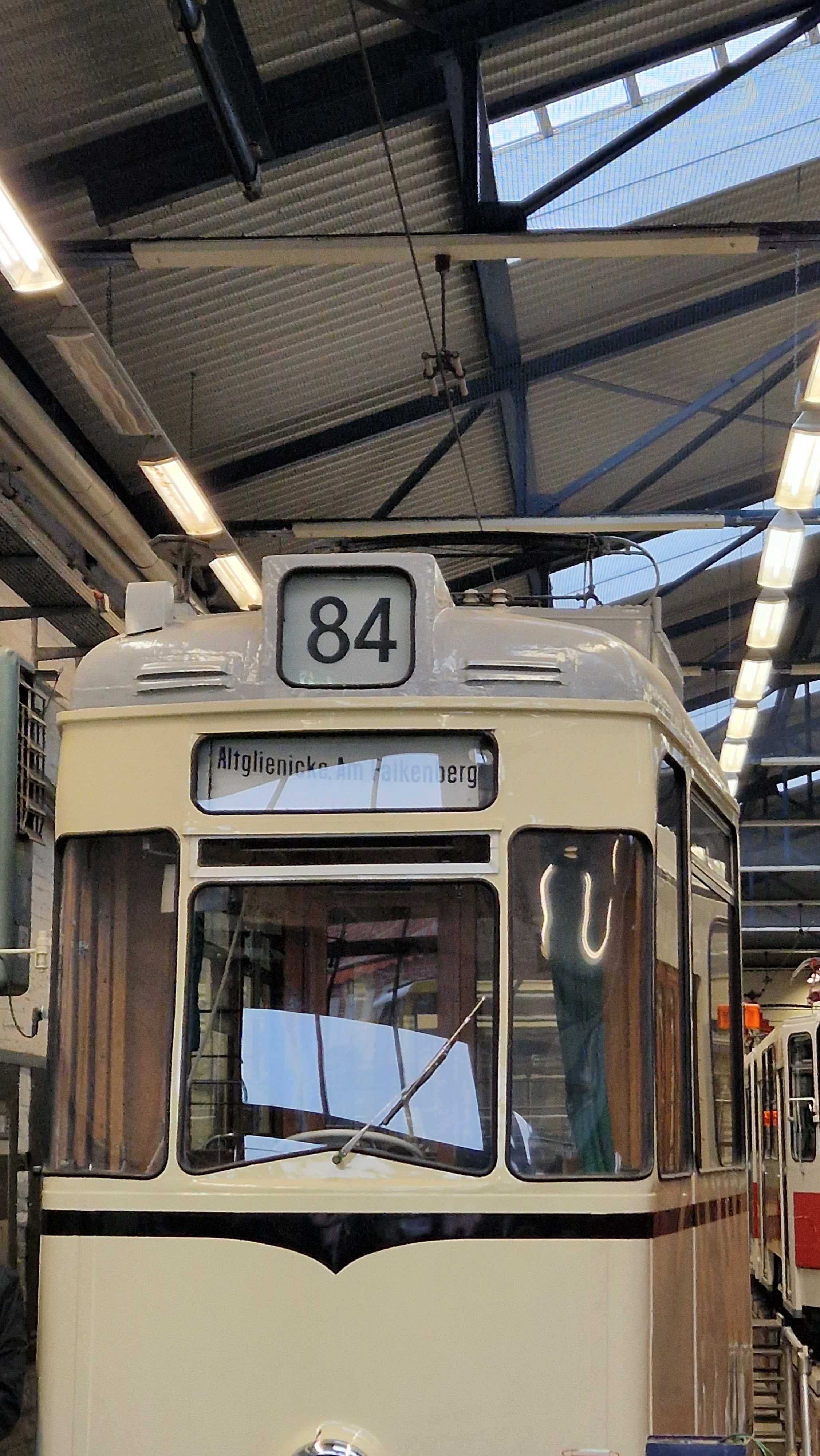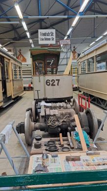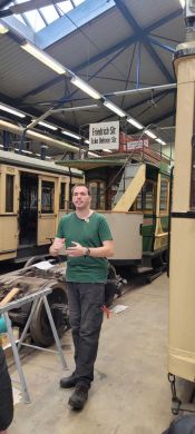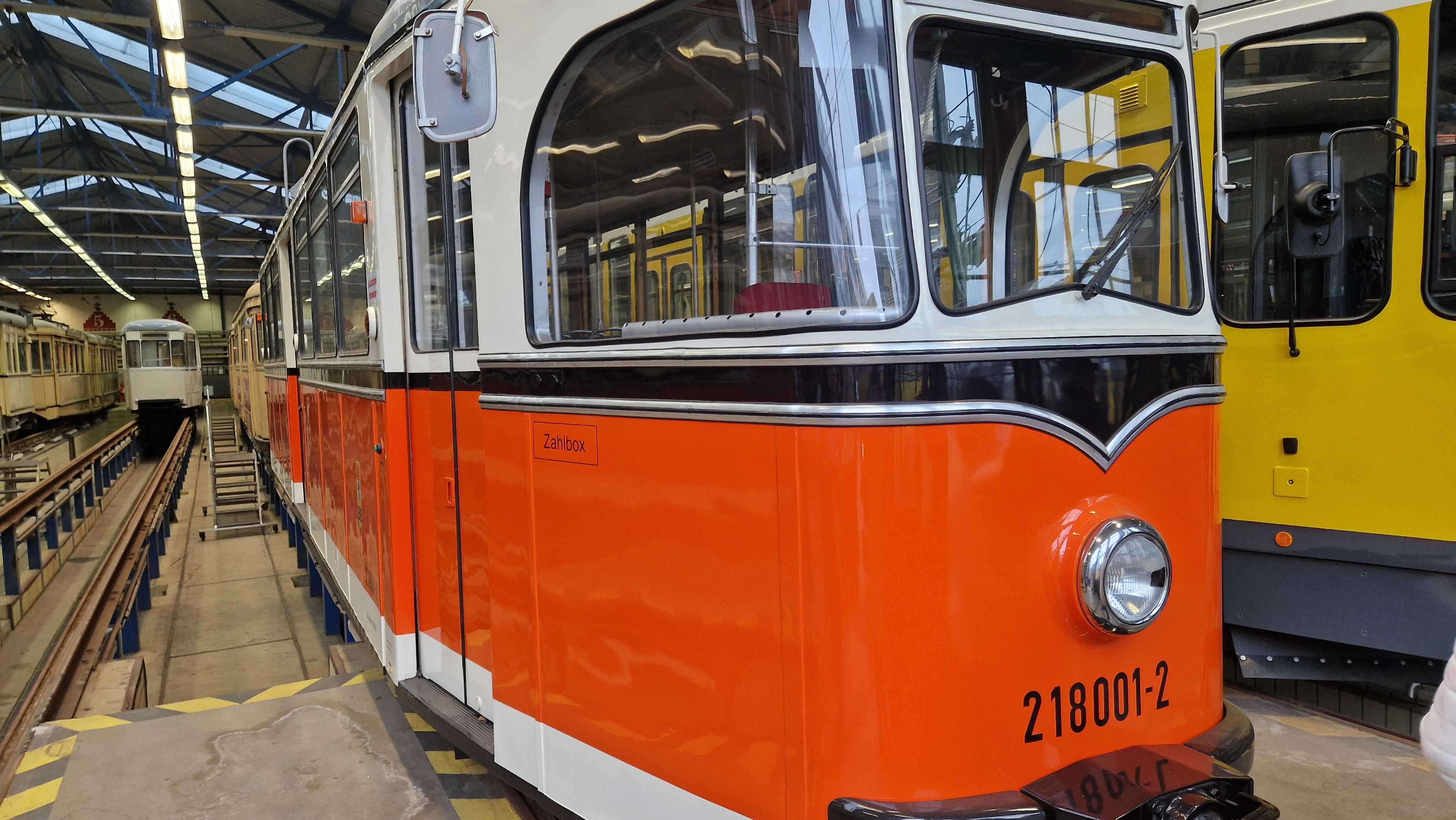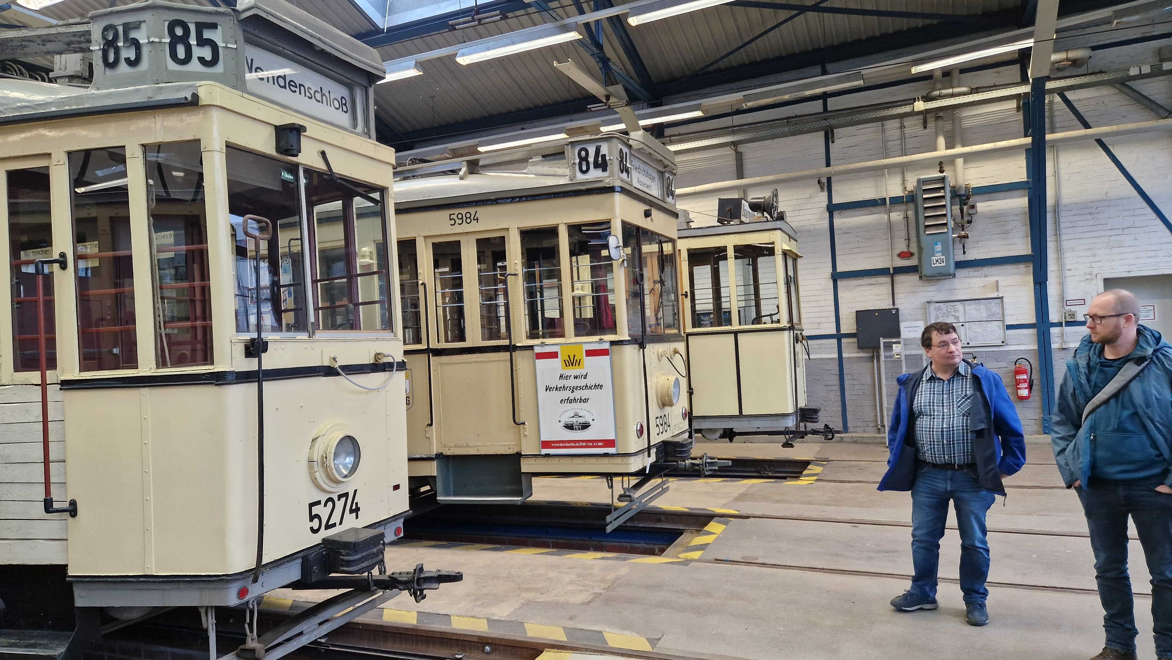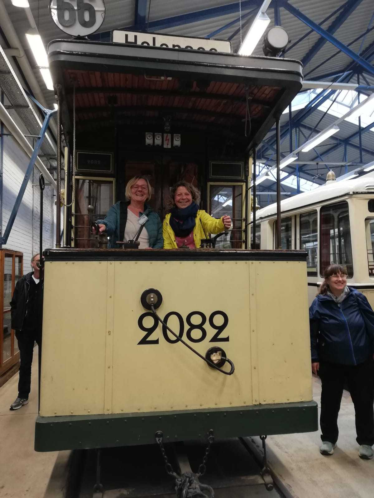 Am nächsten Vormittag (Samstag, 04.10.2025) trafen sich 35 Kurkinder und Begleitungen (davon ein neues Kurkind) vor dem HW-Hotel in Berlin-Kaulsdorf an einem Reisebus, der uns zum Straßenbahnbetriebshof Köpenick brachte. Auf dem Betriebshof Köpenick werden die historischen Straßenbahnen der Berliner Verkehrsbetriebe von ehrenamtlichen Mitarbeitern des Denkmalpflegevereins Nahverkehr gepflegt und gewartet. Dort angekommen, wurden wir von Herrn Hartmut Gröschke, ein Kollege von Kurkind Stefan Peter-Roloff und Mitglied des Vorstandes des DVN empfangen. Das große Glück war uns hold, dass wir zunächst mit der jüngsten historischen Straßenbahn, ein Tatra T6A2mod mit Beiwagen B6A2mod aus Tschechien, Baujahr 1988, Umbau in den 1990er Jahren, vom Betriebshof Köpenick nach Wendenschloß und wieder zurückfahren konnten. Im Anschluss haben wir einen tollen Einblick in mehr als 160 Jahre Straßenbahngeschichte Berlins erhalten. Unter fachkundiger Führung durch das Team der Mitarbeitenden beim DVN dürften wir bis ins Detail den Fahrzeugpark bis hin zu den neuesten Fahrzeugen besichtigen. Es war ein MockUp-Model der neuesten Berliner Straßenbahn zu sehen, der Urbanliner (kurz UBL), von denen bisher 4 Fahrzeuge geliefert worden sind, derzeit getestet werden und etwa zum Jahresende 2025 in den Linienbetrieb überführt werden sollen.