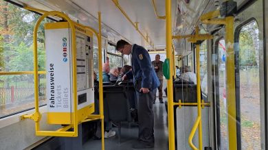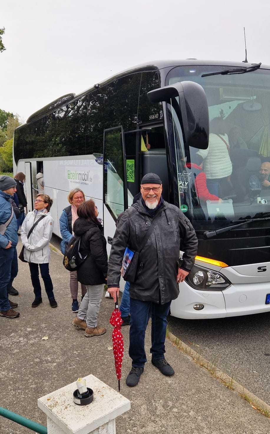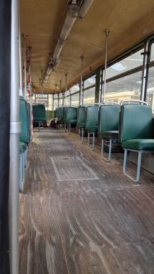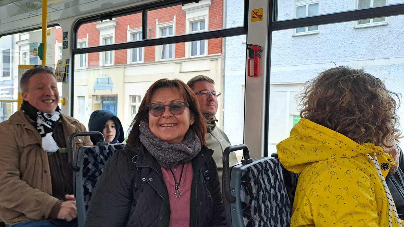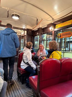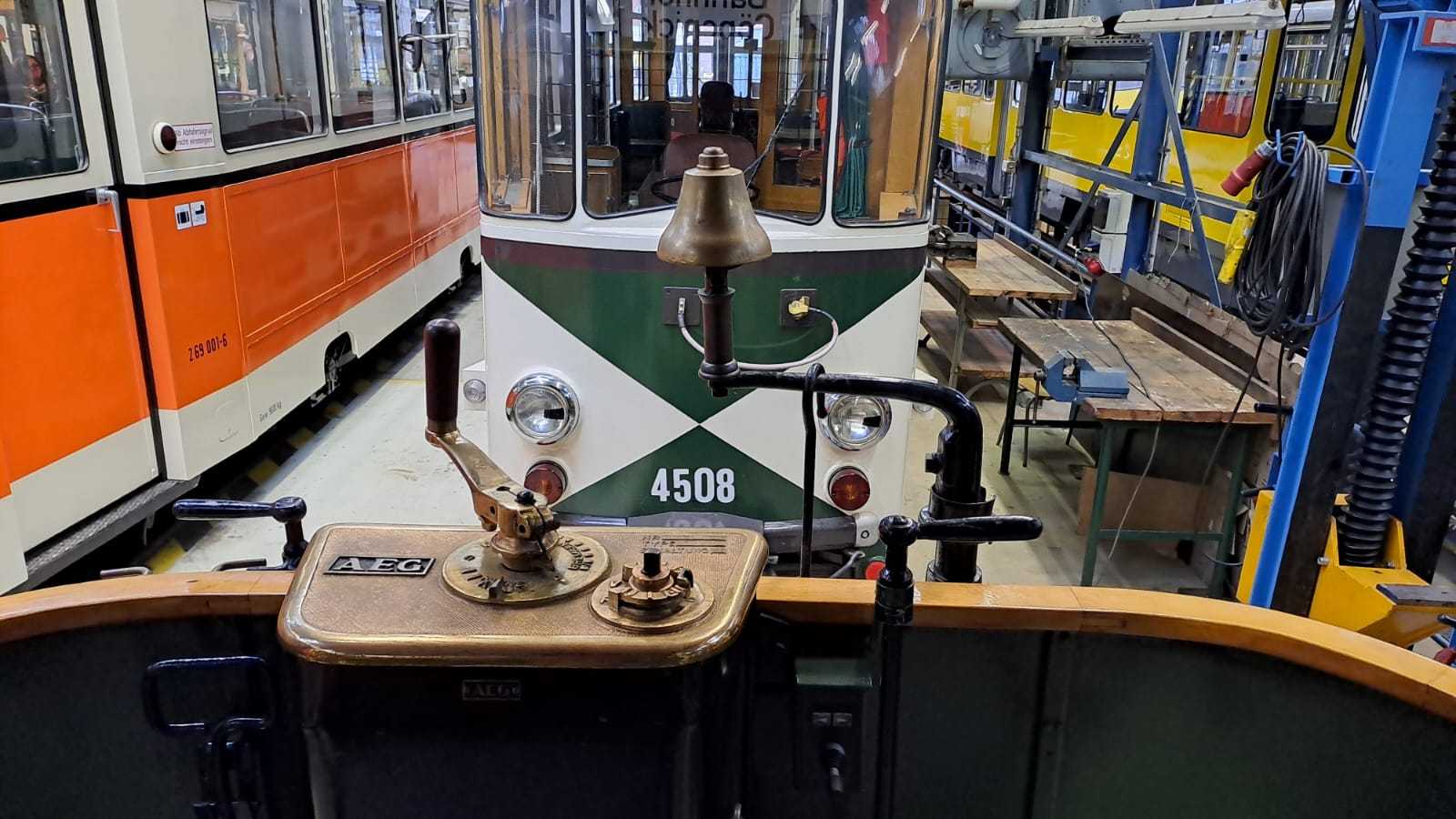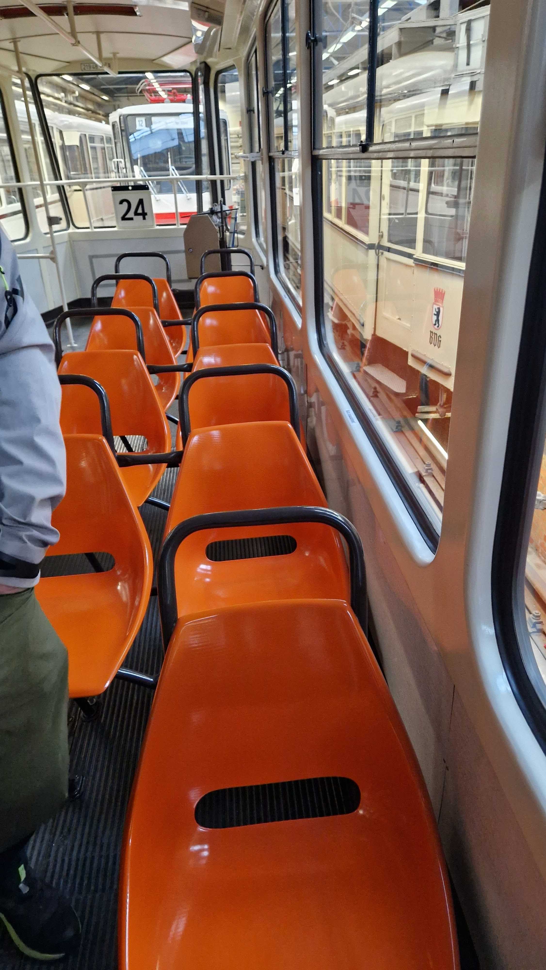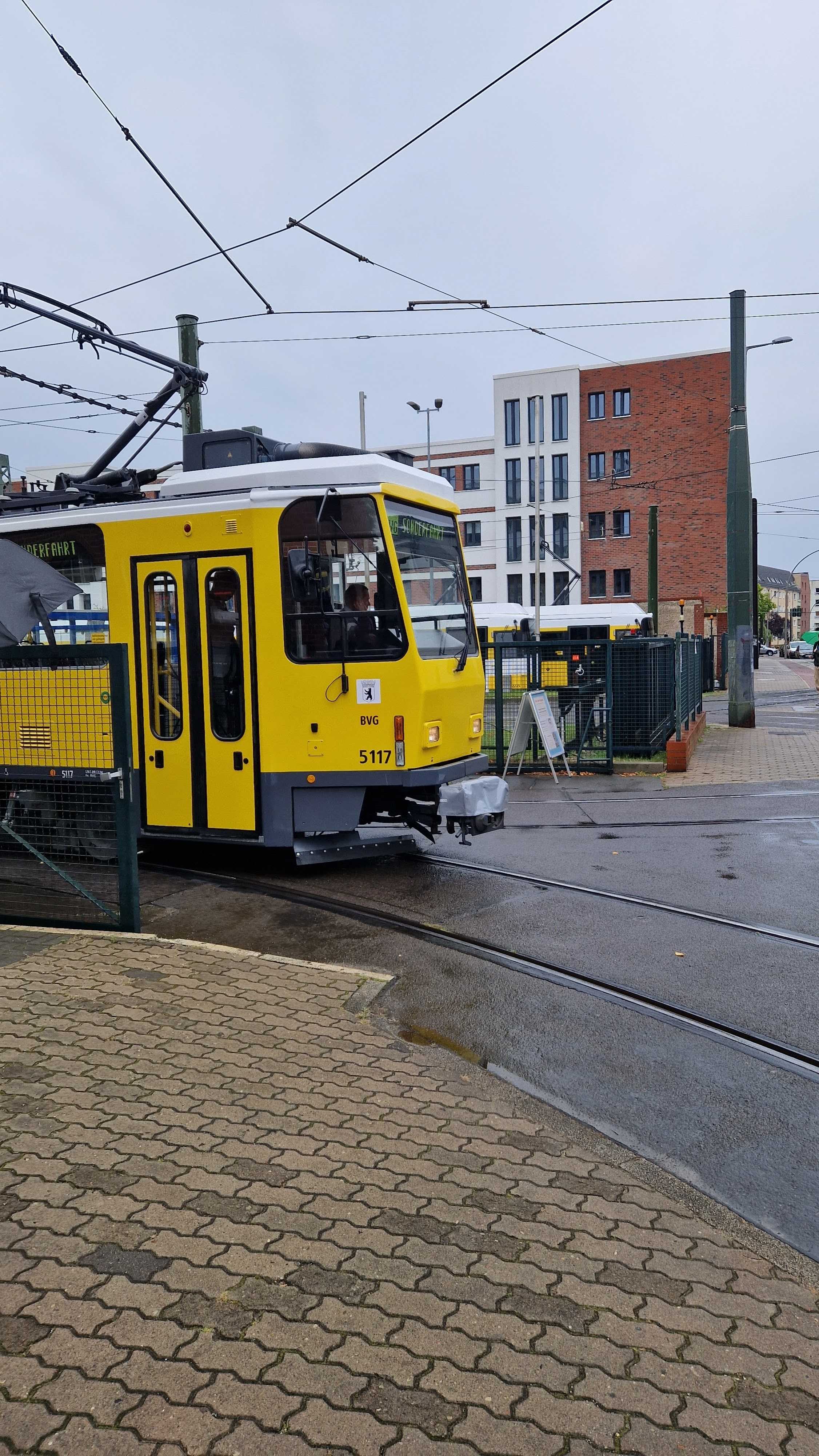 Am nächsten Vormittag (Samstag, 04.10.2025) trafen sich 35 Kurkinder und Begleitungen (davon ein neues Kurkind) vor dem HW-Hotel in Berlin-Kaulsdorf an einem Reisebus, der uns zum Straßenbahnbetriebshof Köpenick brachte. Auf dem Betriebshof Köpenick werden die historischen Straßenbahnen der Berliner Verkehrsbetriebe von ehrenamtlichen Mitarbeitern des Denkmalpflegevereins Nahverkehr gepflegt und gewartet. Dort angekommen, wurden wir von Herrn Hartmut Gröschke, ein Kollege von Kurkind Stefan Peter-Roloff und Mitglied des Vorstandes des DVN empfangen. Das große Glück war uns hold, dass wir zunächst mit der jüngsten historischen Straßenbahn, ein Tatra T6A2mod mit Beiwagen B6A2mod aus Tschechien, Baujahr 1988, Umbau in den 1990er Jahren, vom Betriebshof Köpenick nach Wendenschloß und wieder zurückfahren konnten. Im Anschluss haben wir einen tollen Einblick in mehr als 160 Jahre Straßenbahngeschichte Berlins erhalten. Unter fachkundiger Führung durch das Team der Mitarbeitenden beim DVN dürften wir bis ins Detail den Fahrzeugpark bis hin zu den neuesten Fahrzeugen besichtigen. Es war ein MockUp-Model der neuesten Berliner Straßenbahn zu sehen, der Urbanliner (kurz UBL), von denen bisher 4 Fahrzeuge geliefert worden sind, derzeit getestet werden und etwa zum Jahresende 2025 in den Linienbetrieb überführt werden sollen.