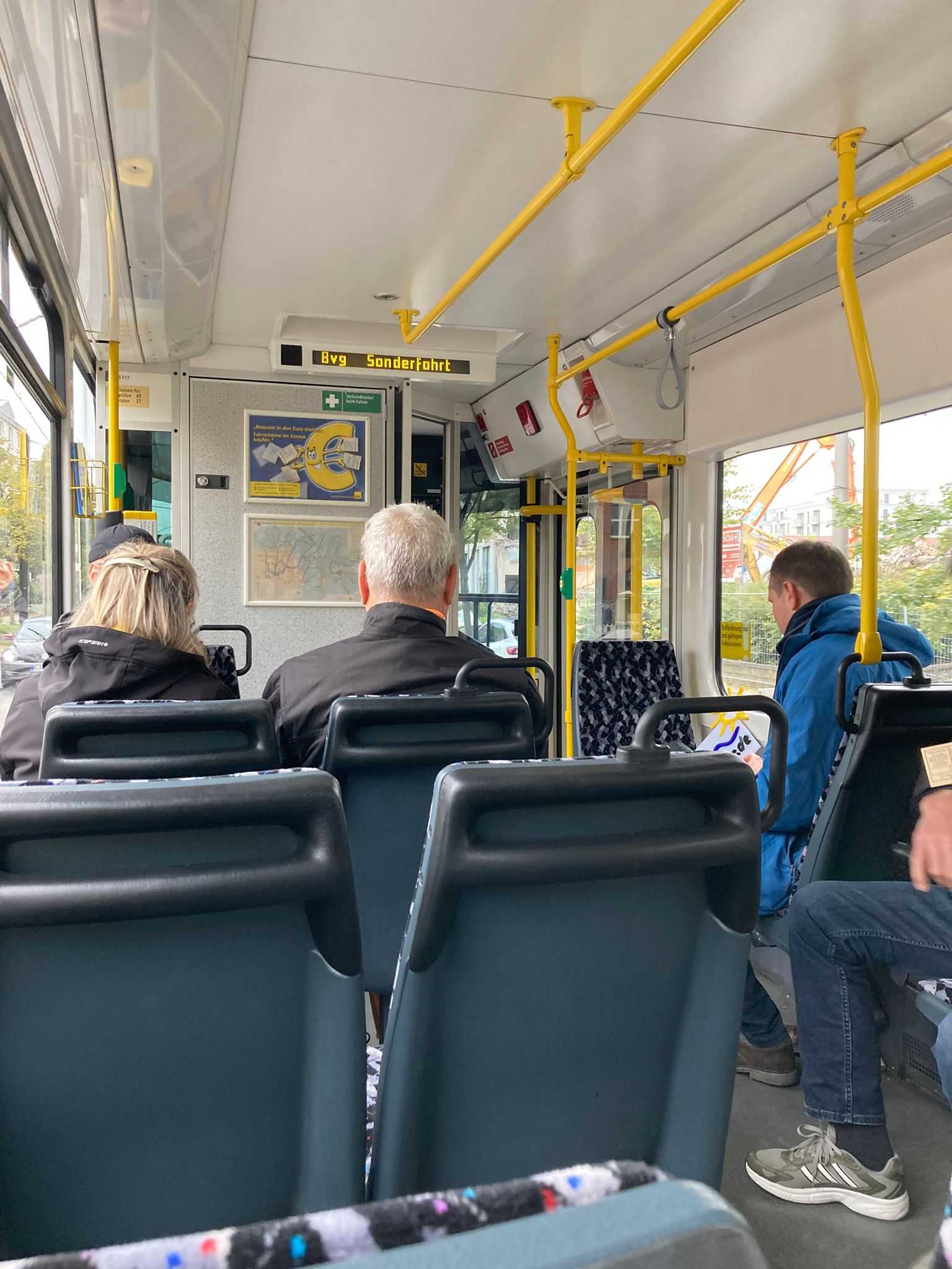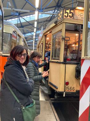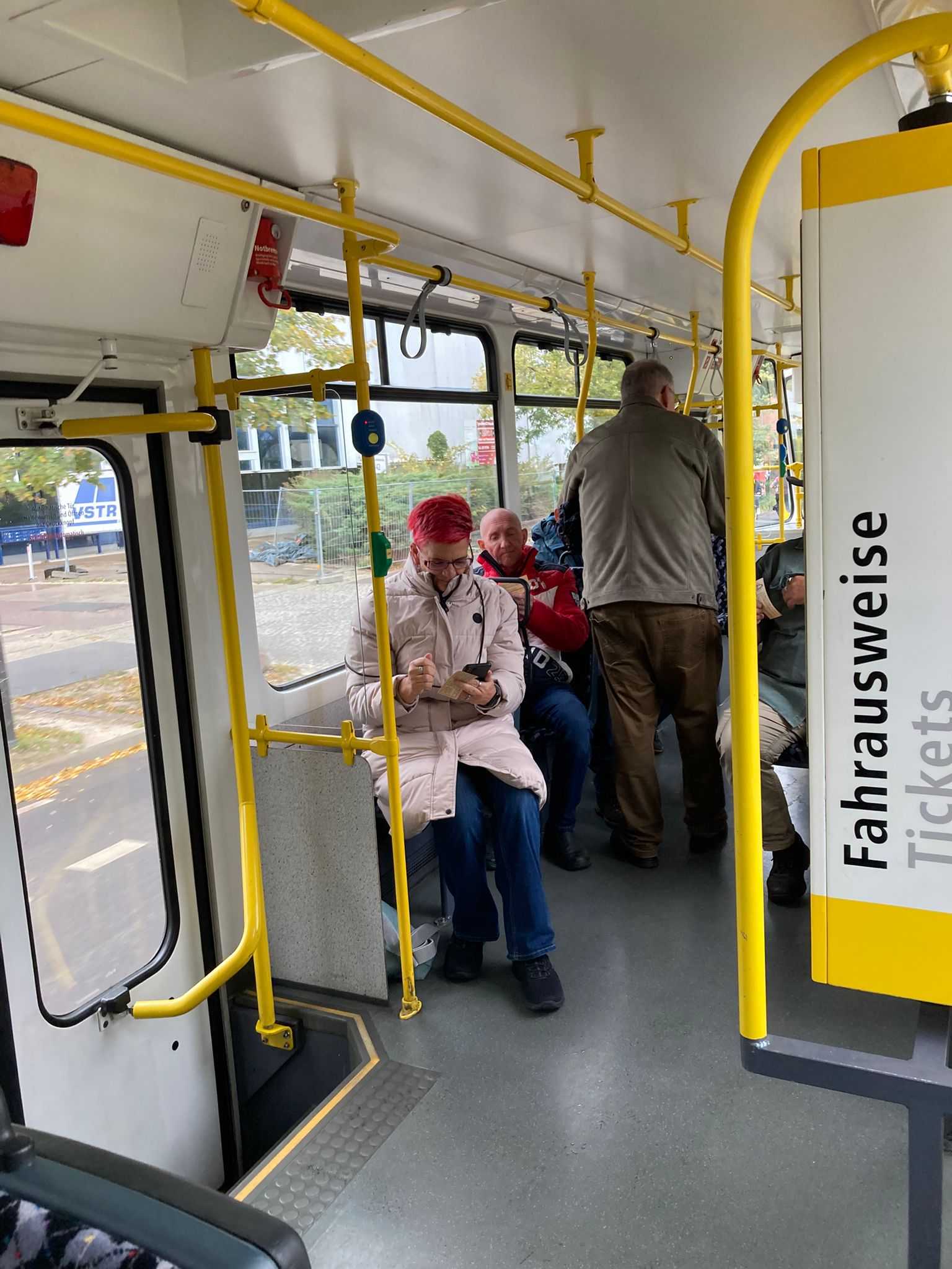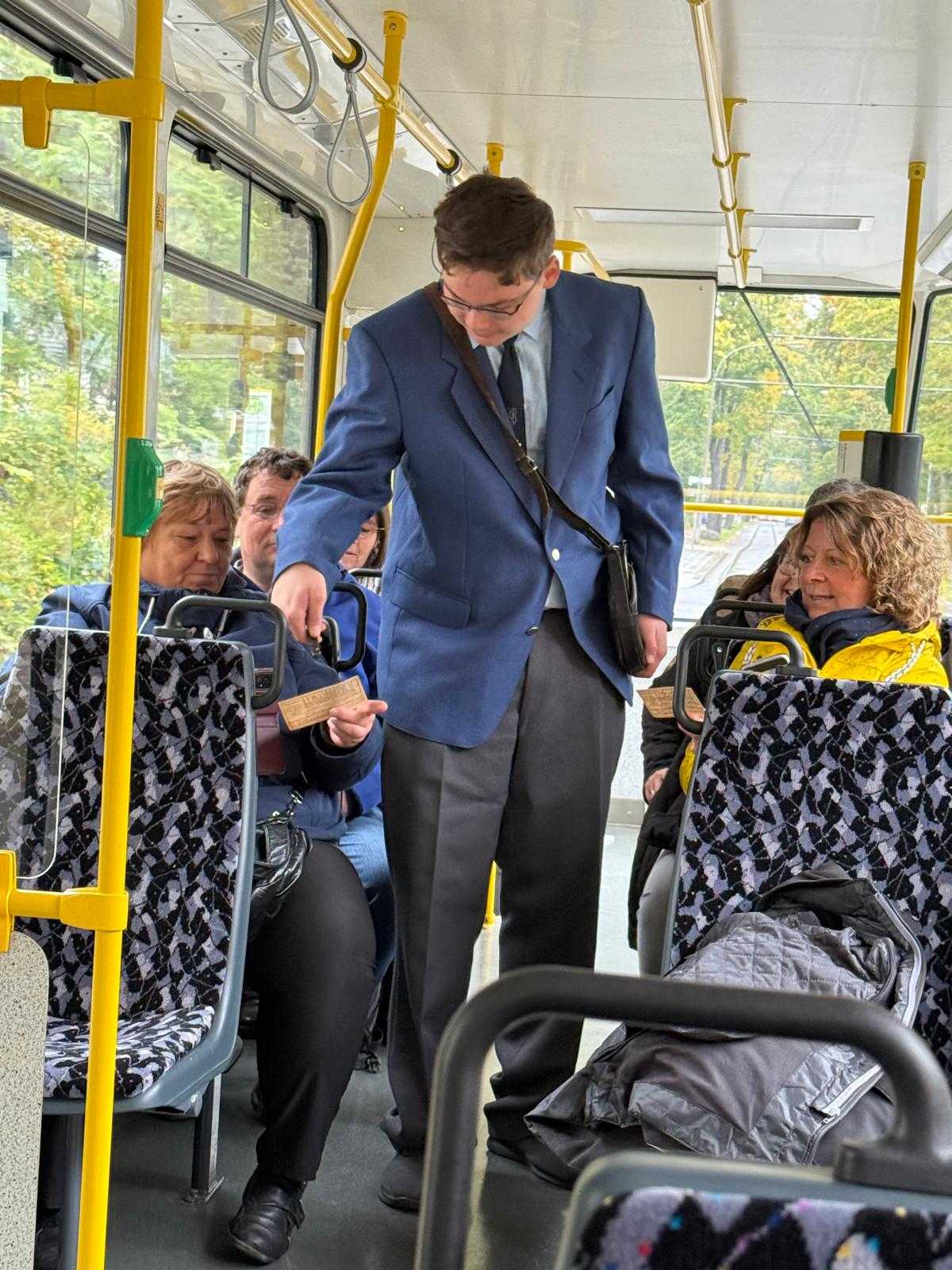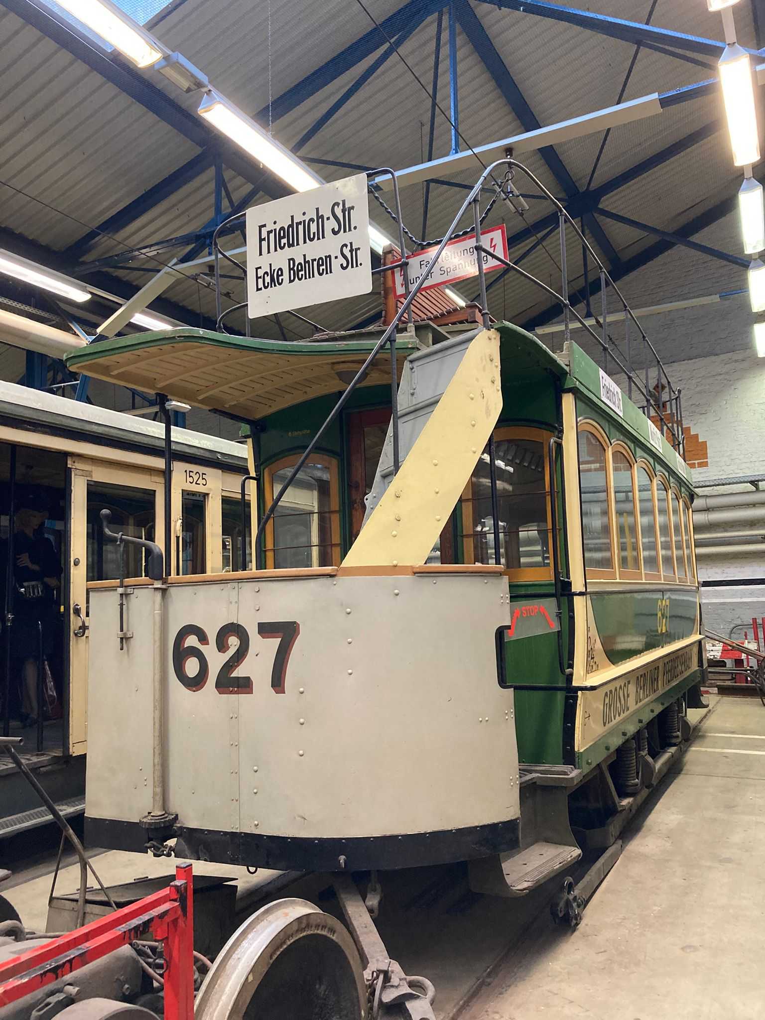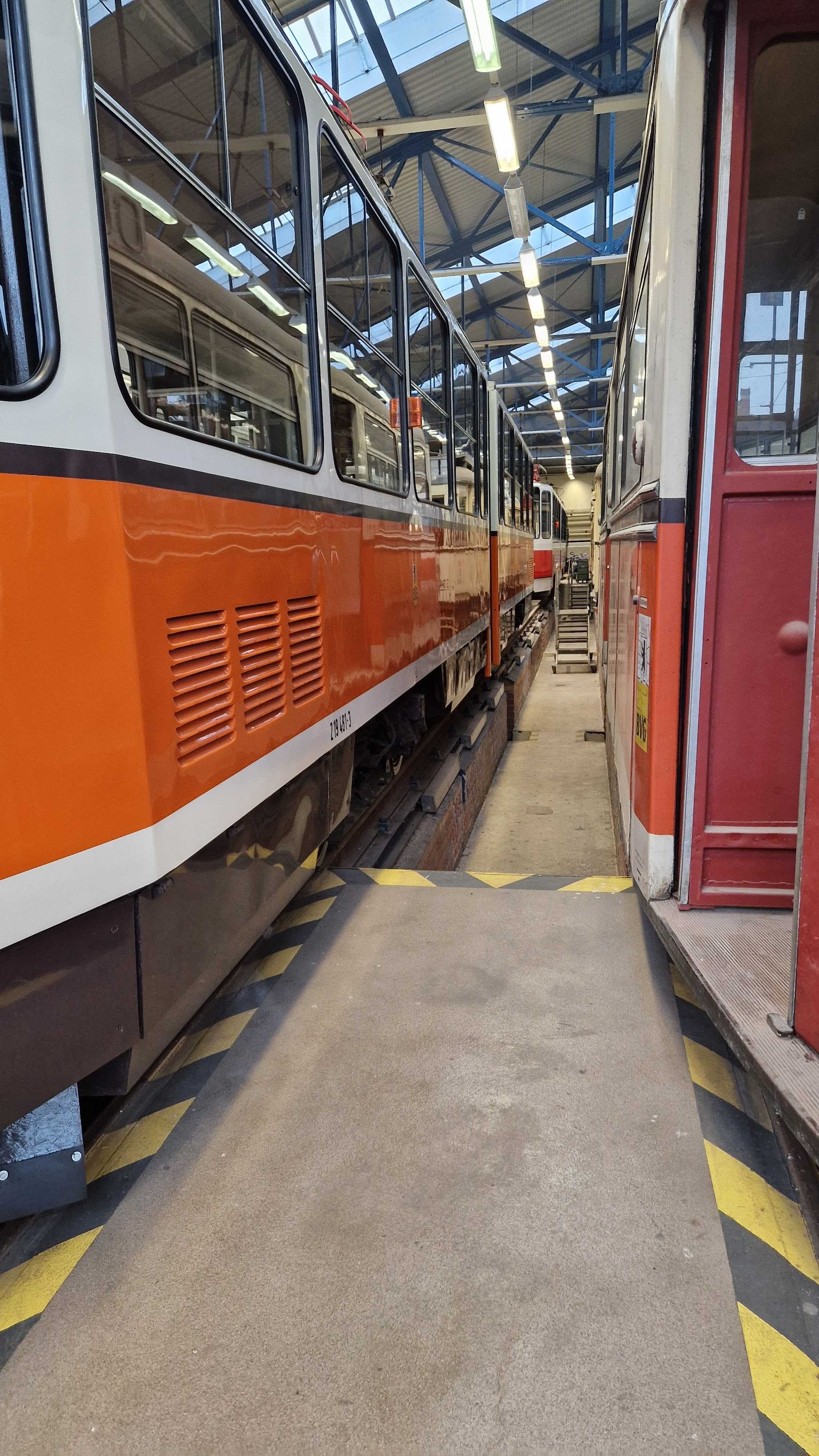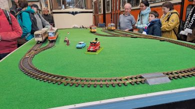 Am nächsten Vormittag (Samstag, 04.10.2025) trafen sich 35 Kurkinder und Begleitungen (davon ein neues Kurkind) vor dem HW-Hotel in Berlin-Kaulsdorf an einem Reisebus, der uns zum Straßenbahnbetriebshof Köpenick brachte. Auf dem Betriebshof Köpenick werden die historischen Straßenbahnen der Berliner Verkehrsbetriebe von ehrenamtlichen Mitarbeitern des Denkmalpflegevereins Nahverkehr gepflegt und gewartet. Dort angekommen, wurden wir von Herrn Hartmut Gröschke, ein Kollege von Kurkind Stefan Peter-Roloff und Mitglied des Vorstandes des DVN empfangen. Das große Glück war uns hold, dass wir zunächst mit der jüngsten historischen Straßenbahn, ein Tatra T6A2mod mit Beiwagen B6A2mod aus Tschechien, Baujahr 1988, Umbau in den 1990er Jahren, vom Betriebshof Köpenick nach Wendenschloß und wieder zurückfahren konnten. Im Anschluss haben wir einen tollen Einblick in mehr als 160 Jahre Straßenbahngeschichte Berlins erhalten. Unter fachkundiger Führung durch das Team der Mitarbeitenden beim DVN dürften wir bis ins Detail den Fahrzeugpark bis hin zu den neuesten Fahrzeugen besichtigen. Es war ein MockUp-Model der neuesten Berliner Straßenbahn zu sehen, der Urbanliner (kurz UBL), von denen bisher 4 Fahrzeuge geliefert worden sind, derzeit getestet werden und etwa zum Jahresende 2025 in den Linienbetrieb überführt werden sollen.